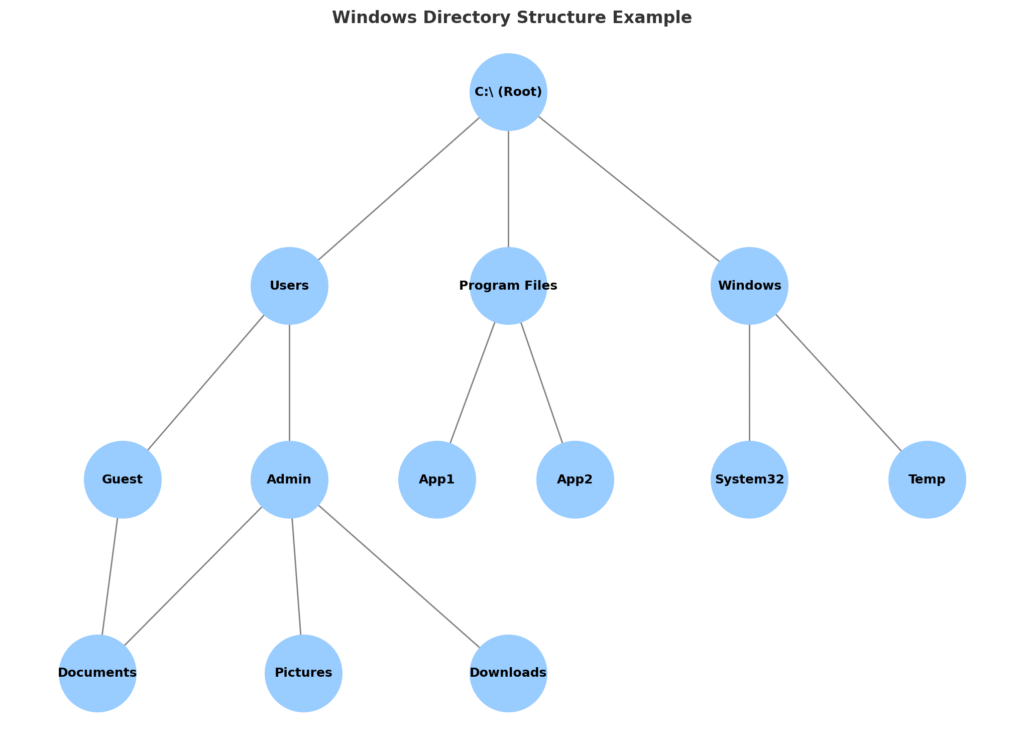 Here’s a Windows Directory Structure diagram showing the root (C:\) with its main folders (Users, Program Files, Windows) and subfolders (Documents, Pictures, System32, etc.).