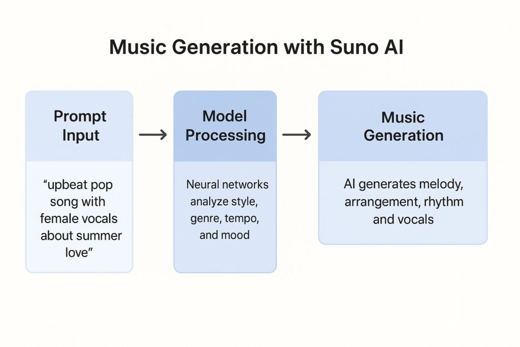 Suno AI is an advanced generative AI platform that creates original music — including melody, harmony, lyrics, and vocals — based on user prompts. It uses deep learning models trained on large music datasets, enabling anyone to compose songs without traditional music skills.